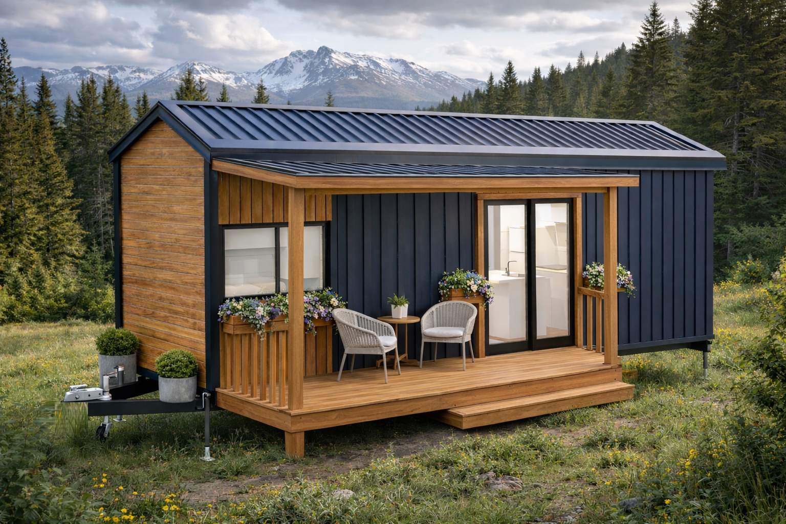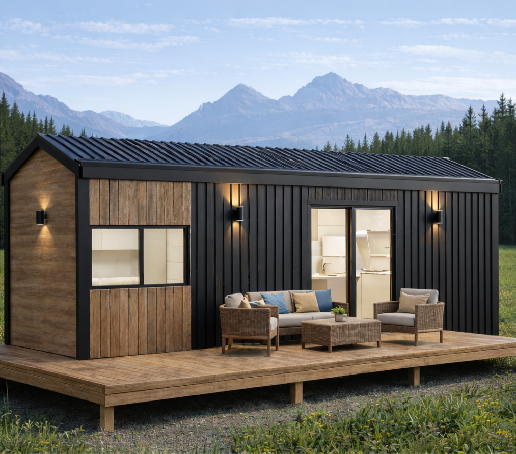 Minimal çizgilerin, bu küçük evin dış cephesine sadelik ve kendine has bir karakter oluşturduğu Econ One modelimiz, yoğunlukla yüksek yalıtımlı kompozit alüminyum paneller ile modern dokunuşları ve doğallığı yansıtan ahşap kompozit panel konseptiyle sade bir tasarıma sahiptir.