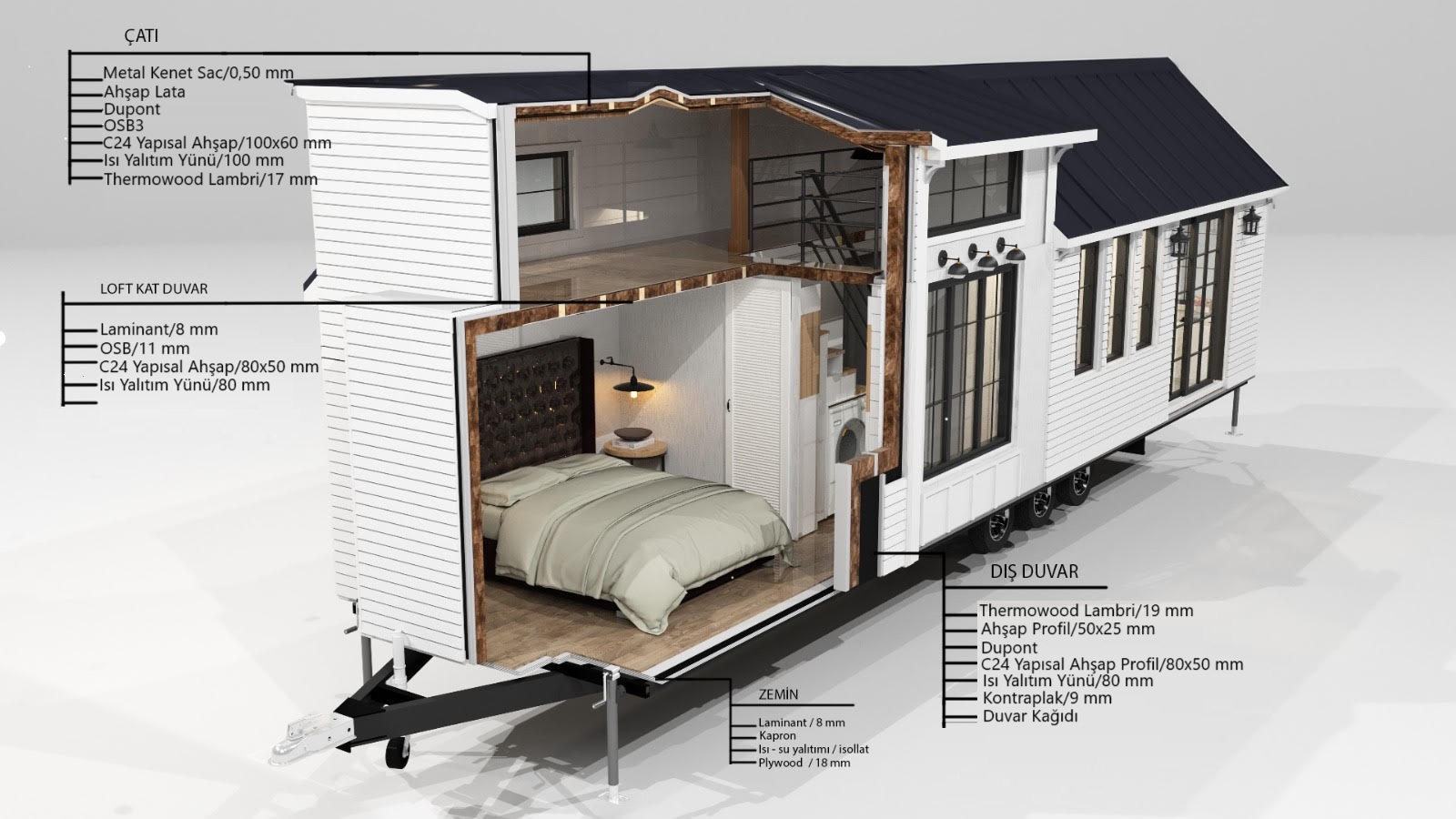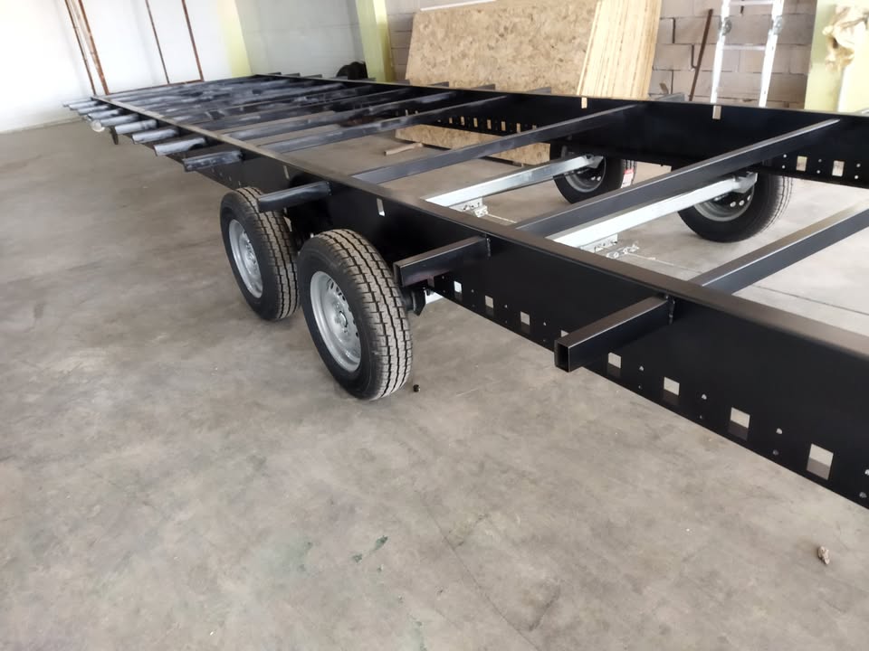 - Tiny house römorklarda taşıyıcı şasi olarak 3 mm çift bükülmüş, lazer kesim, kıvrımlarla güçlendirilmiş sac ana şasi bulunmaktadır.