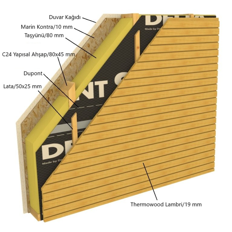 Duvar içlerindeki izolasyonda nem olmamasını sağlayan ve ahşabı neme karşı koruyan tek taraflı hava ve nem geçirgenliğine sahip Tyvek uygulanmıştır.